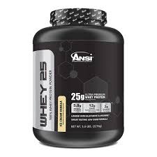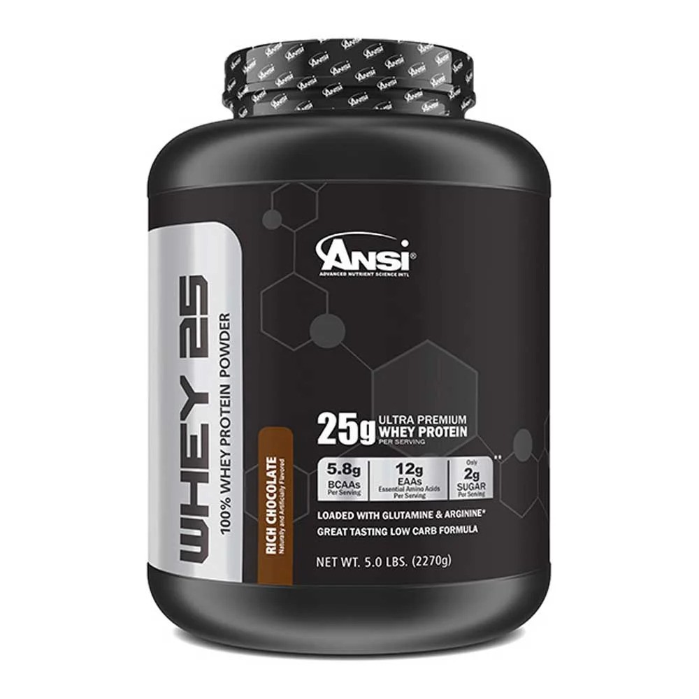 | ANSI’s Whey 25™ is a premium whey protein blend consisting of whey protein concentrate and whey protein isolate. 25g Premium Muscle-Building Protein. Loaded with Glutamine, Arginine and BCAAs. Only 2g Fat. No Aspartame. Gluten Free. |