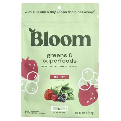 Bloom Greens & Superfoods Berry flavor comes in convenient 5 stick packs, offering a blend of greens and superfoods designed to support digestion, bloating relief, and energy. Each single-serve packet makes it easy to get your daily dose of nutrients with a delicious berry taste.