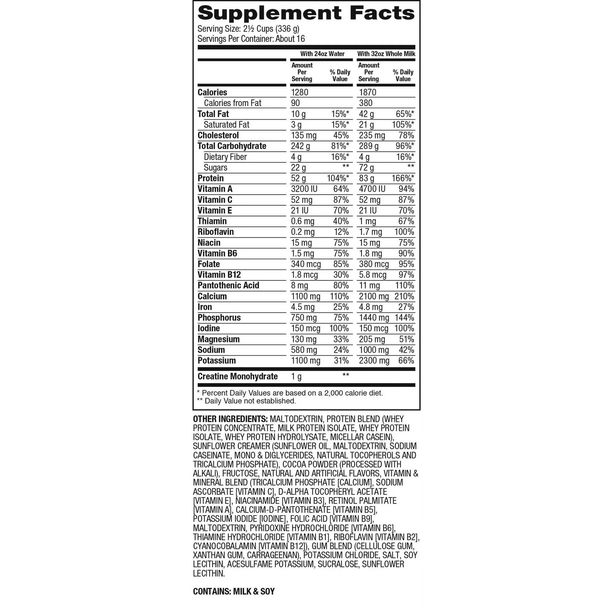 Each portion contains 52 g of high-quality protein, including 11–12 g of naturally occurring BCAAs + 1 g of creatine and, depending on flavour, up to 243 g carbohydrates and low in sugars.