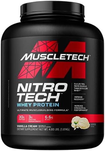 Muscletech Nitro-Tech Performance Series is a bodybuilding supplement formulated with both domestic and international ingredients. The most powerful protein complex ever developed with Whey Isolate and Whey Peptides Designed to Build Lean Muscle Designed for Athletes for More Muscle, Strength, and Better Performance. Most pure protein sources are available to athletes, as 1 scoop of Nitro-Tech contains 30g of protein, only 4g of carbohydrates, and 2.5g of fat